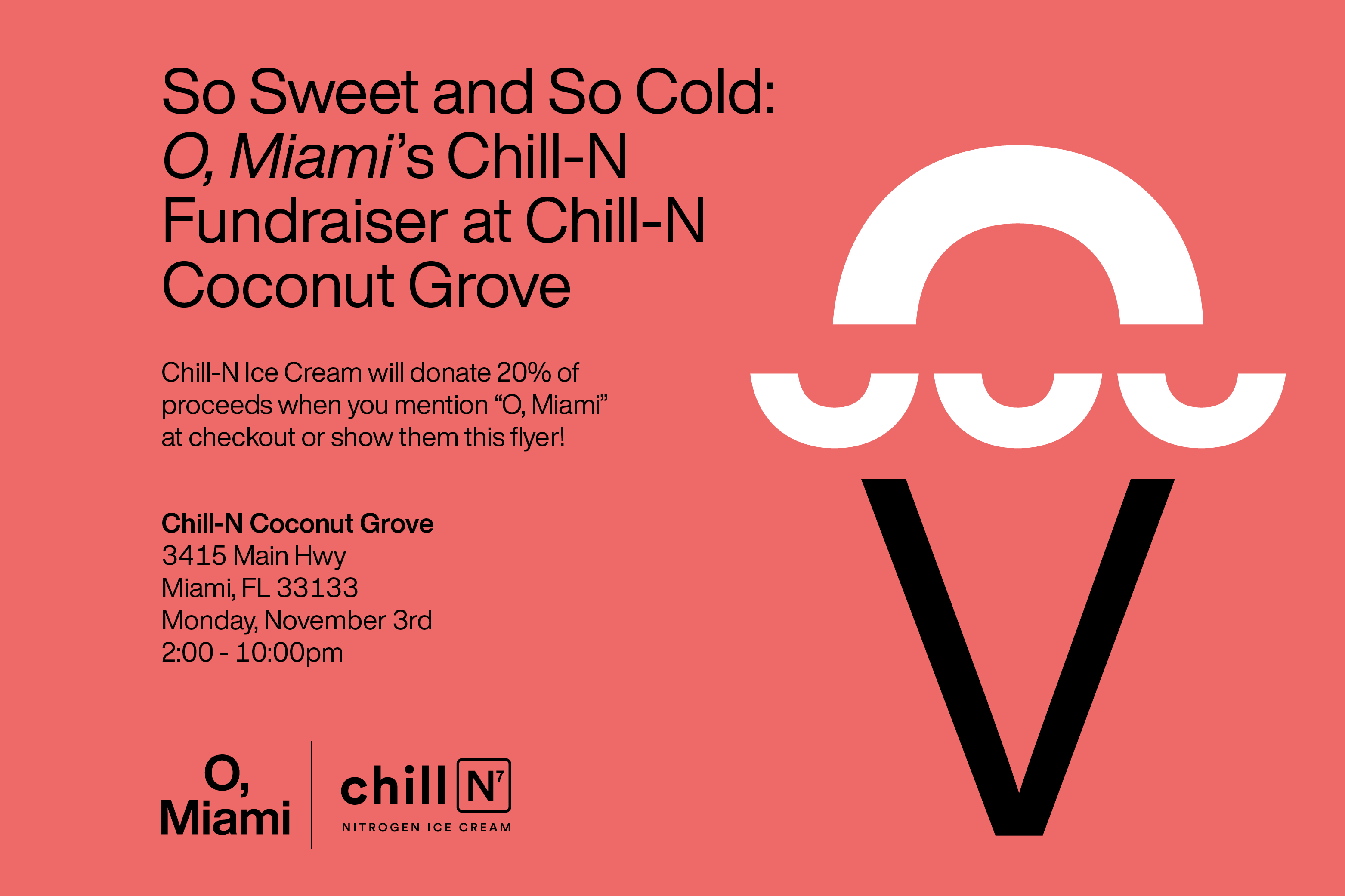 On Monday, November 3rd, join us for a sweet fundraiser at Chill-N in Coconut Grove! Chill-N Ice Cream will donate 20% of proceeds when you mention "O, Miami" at checkout or show them this flyer: